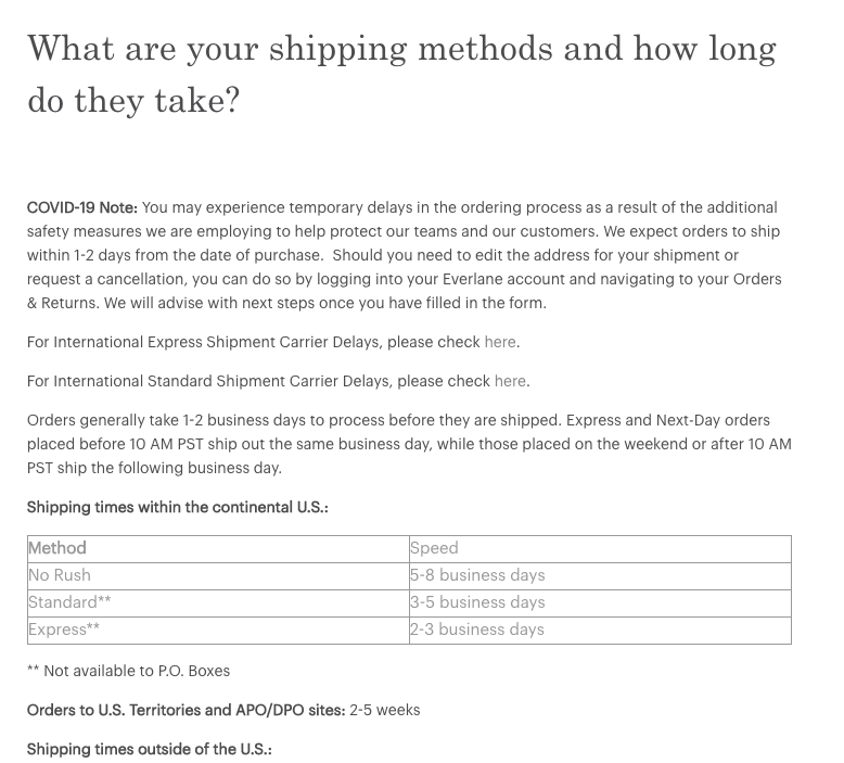 อย่างที่คุณเห็น Everlane ได้เพิ่มหมายเหตุเกี่ยวกับโควิด-19 เพื่อแจ้งให้ลูกค้าทราบว่าอาจเกิดความล่าช้า แม้ว่าคุณจะไม่ประสบกับความล่าช้าในการจัดส่งที่คาดหวัง แต่ก็ไม่เสียหายที่จะถ่ายทอดความเป็นไปได้ที่จะเกิดขึ้น