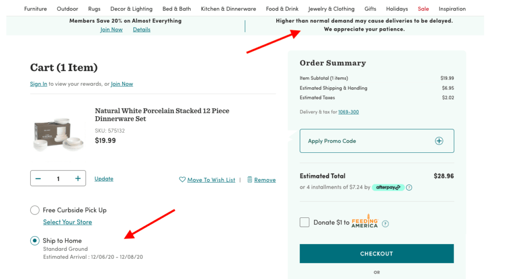 นี่คือตัวอย่างจาก Cost Plus World Market ที่ให้ทั้งกรอบเวลาการจัดส่งโดยประมาณและช่วยให้ลูกค้าทราบว่าสามารถคาดหวังการจัดส่งล่าช้าได้