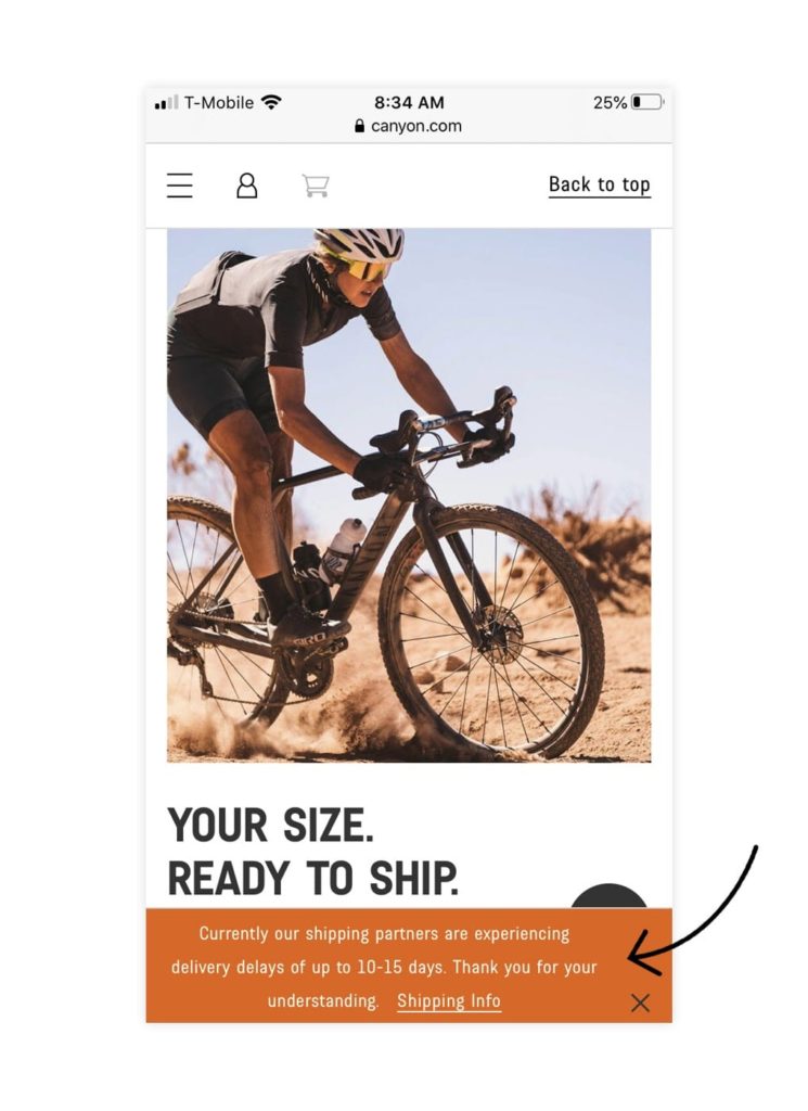 จากนั้นในช่วงเวลาที่คุณประสบปัญหาในการจัดส่ง คุณสามารถโฆษณาได้ทั่วทั้งไซต์ นี่คือตัวอย่างจากแบรนด์ Canyon DTC ของจักรยานยนต์