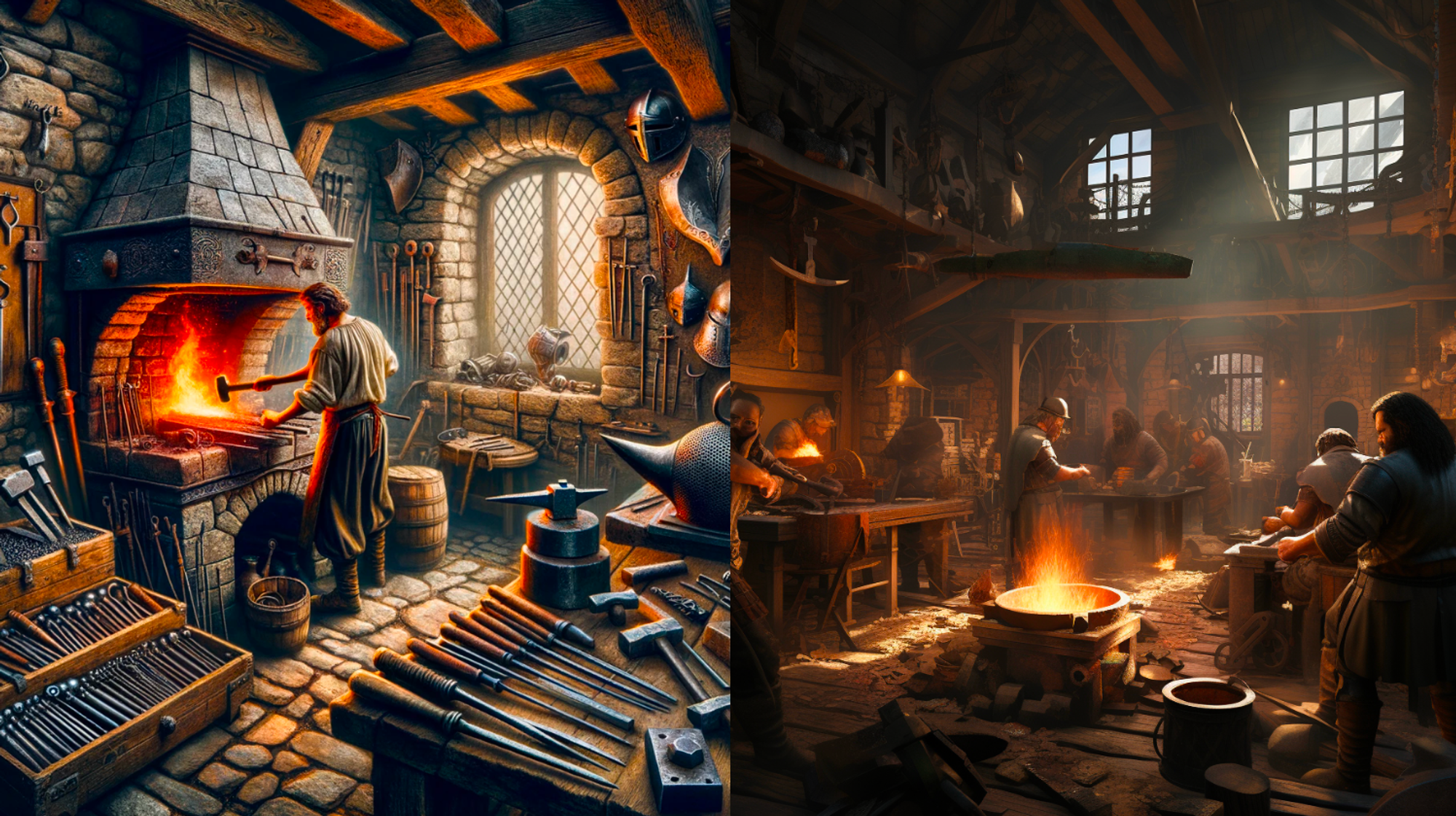 คนซ้ายของ Dall-E มีช่างตีเหล็กหนึ่งคน เครื่องมือที่จัดอย่างประณีต และชุดเกราะไฮไลท์ ร้านที่ใช่จาก Midjourney มีคนหลายคน อุปกรณ์กระจัดกระจาย และบรรยากาศที่มีชีวิตชีวา แม้ว่าทั้งสองภาพจะบรรยายถึงเวิร์กช็อป แต่ภาพของ Dall-E มุ่งเน้นไปที่ช่างฝีมือเพียงคนเดียวและเครื่องมือของเขา ส่วนภาพ Midjourney ให้ความรู้สึกเหมือนเป็นวันที่วุ่นวายกับคนงานหลายคน