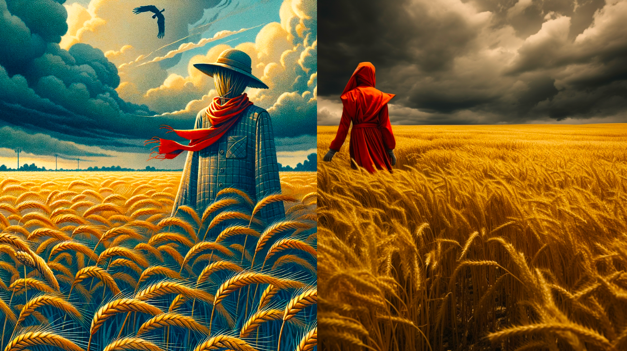 รูปภาพ Dall-E 3 มีสไตล์ภาพประกอบที่มีรายละเอียดพร้อมโทนสีทองที่อบอุ่น แสดงให้เห็นรูปร่างที่เหมือนหุ่นไล่กา ในทางตรงกันข้าม ภาพของ Midjourney ให้ความรู้สึกเหมือนภาพถ่ายมากกว่า โดยเน้นที่ร่างที่ปิดบังอยู่ในพายุที่กำลังก่อตัว ซึ่งวาดด้วยโทนสีซีเปีย มันพลาดหุ่นไล่กาไปอย่างสิ้นเชิง