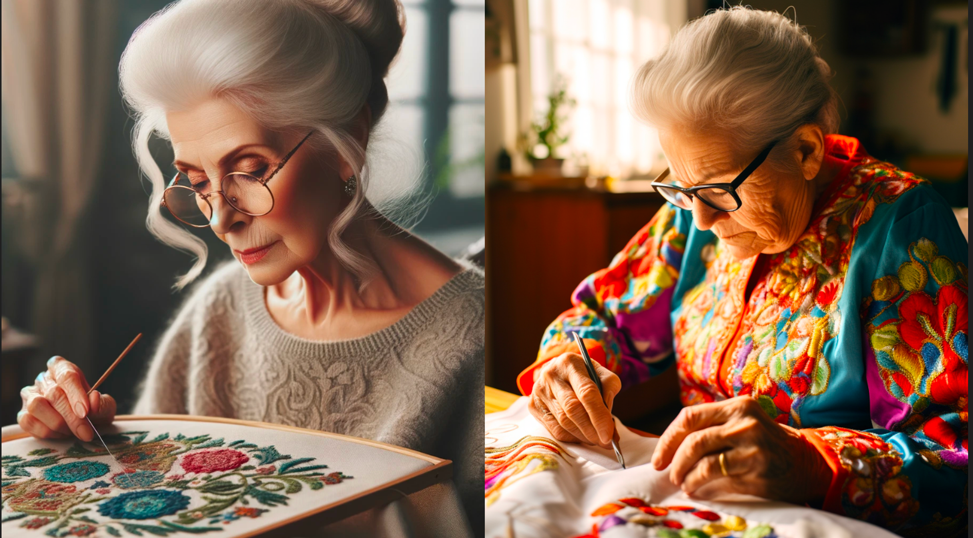 สองภาพนี้จับภาพหญิงสูงอายุคนหนึ่งที่ทำงานปักได้อย่างสวยงาม ภาพ Dall-E 3 ทางด้านซ้ายแสดงให้เห็นผู้หญิงคนหนึ่งสวมแว่นตาวินเทจที่โดดเด่นและมีผมสีเงินมัดเป็นมวย เธอกำลังทำงานในรูปแบบที่มีชีวิตชีวา บรรยากาศได้รับการขัดเกลาด้วยแสงไฟนวลตาที่เน้นคุณลักษณะของเธอ ภาพลักษณ์ที่เหมาะสมของ Midjourney ดูตรงไปตรงมามากขึ้น โดยที่หญิงสาวสวมแว่นกรอบสีดำแบบสบายๆ และสวมเสื้อเบลาส์สีสันสดใส