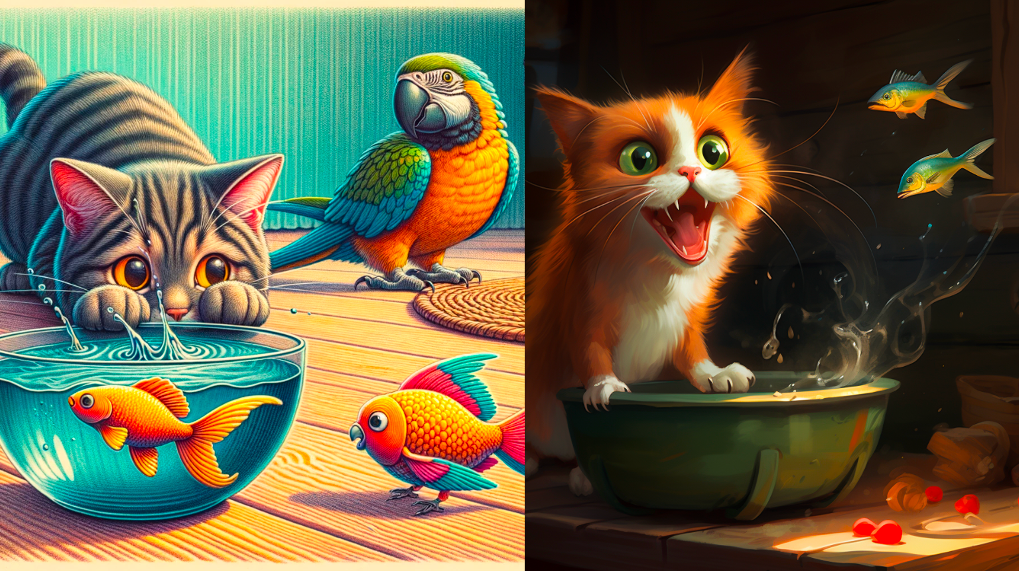 ทั้งสองภาพแสดงให้เห็นแมวพยายามหาปลาจากชามที่มีนกแก้วอยู่ใกล้ๆ ภาพของ Dall-E 3 ทางด้านซ้ายมีแมวลายสีเทากำลังแตะน้ำอย่างสงบ และนกแก้วก็เฝ้าดูอยู่