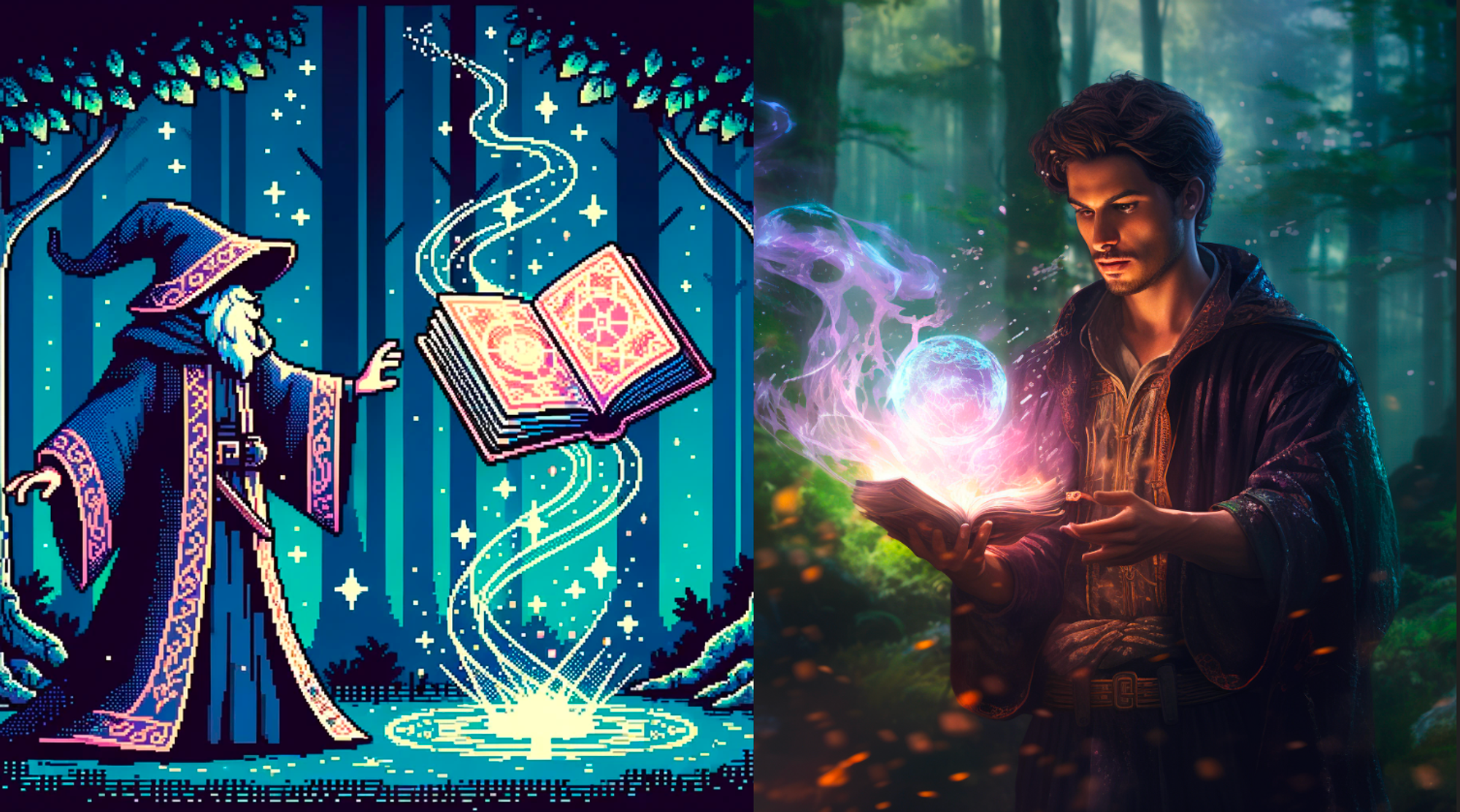 ทางด้านซ้าย Dall-E 3 นำเสนอภาพพิกเซลของพื้นหลังป่า โดยมีนักเวทย์สวมหมวกทรงสูงสีน้ำเงินเข้ม จำลองบรรยากาศวิดีโอเกมสมัยเก่า คุณสามารถเห็นอนุภาคเวทย์มนตร์หมุนวนรอบตัวเขาและหนังสือคาถาที่ลอยอยู่ซึ่งเปิดกว้างแสดงหน้าที่เรืองแสงของมัน