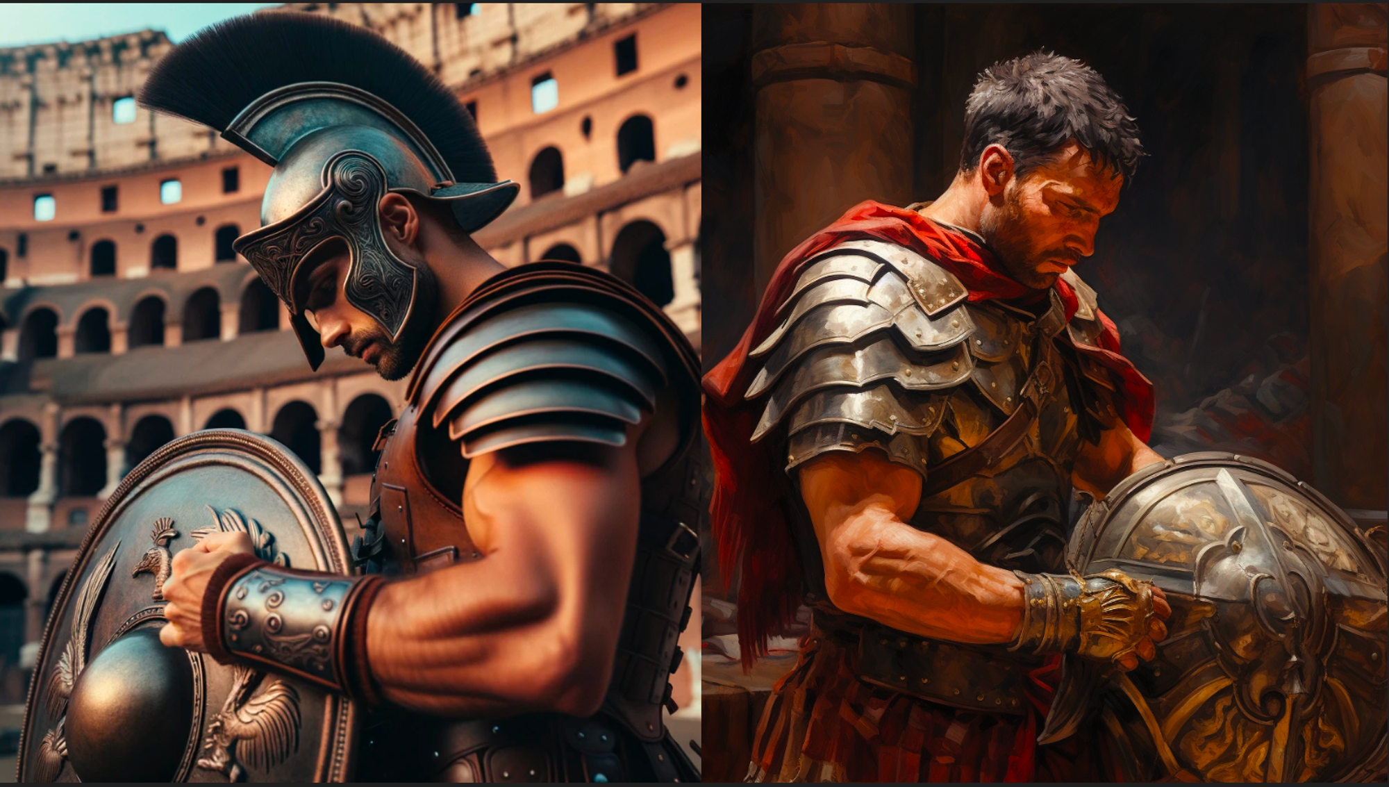 ทางด้านขวา ภาพ Midjourney นำเสนอนักรบกลาดิเอเตอร์ที่แข็งแกร่งยิ่งขึ้นในช่วงเวลาใกล้ชิด นักรบคนนี้ดูเหมือนจมอยู่ในความคิด บางทีอาจกำลังไตร่ตรองถึงการต่อสู้ที่อยู่ข้างหน้า ชุดเกราะของเขาสวมใส่ในการต่อสู้มากขึ้น และฉากนั้นให้ความรู้สึกมืดมนและเข้มข้นยิ่งขึ้น เขาจับโล่อันหรูหราของเขาไว้แน่น แสดงถึงความมุ่งมั่นของเขา