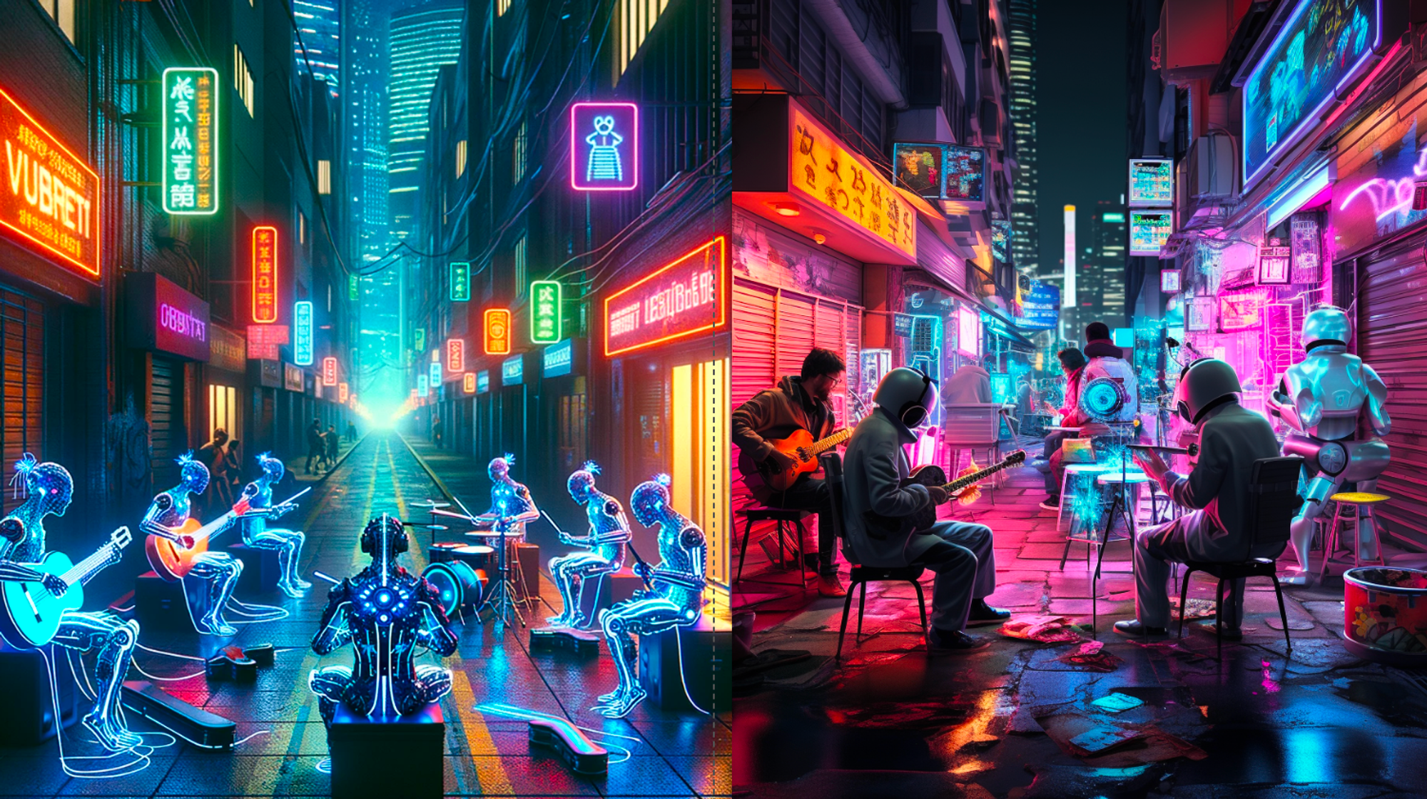 ภาพซ้ายโดย Dall-E 3 แสดงให้เห็นซอยยาวอันเงียบสงบพร้อมนักดนตรีที่มีลักษณะเหมือนเอเลี่ยนและป้ายไฟนีออนสว่างสดใส มันทำให้แน่ใจว่าจะมีรายละเอียดที่สมบูรณ์แบบของพื้นหลังด้วย ภาพที่ถูกต้องโดย Midjourney ให้ความรู้สึกยุ่งมากขึ้น โดยมีการผสมผสานระหว่างมนุษย์และหุ่นยนต์ และตรอกที่กว้างและมีชีวิตชีวาซึ่งเต็มไปด้วยแสงสะท้อนจากแสงนีออน แม้ว่าทั้งสองภาพจะแสดงภาพของนักดนตรีแห่งอนาคตในตรอกซอกซอยที่สว่างไสวด้วยแสงไฟนีออน แต่ร้าน Dall-E's ก็ให้ความรู้สึกเหมือนอยู่บนดาวดวงอื่นมากกว่า และร้าน Midjourney's ก็มีกลิ่นอายของวันนี้และอนาคตผสมผสานกัน