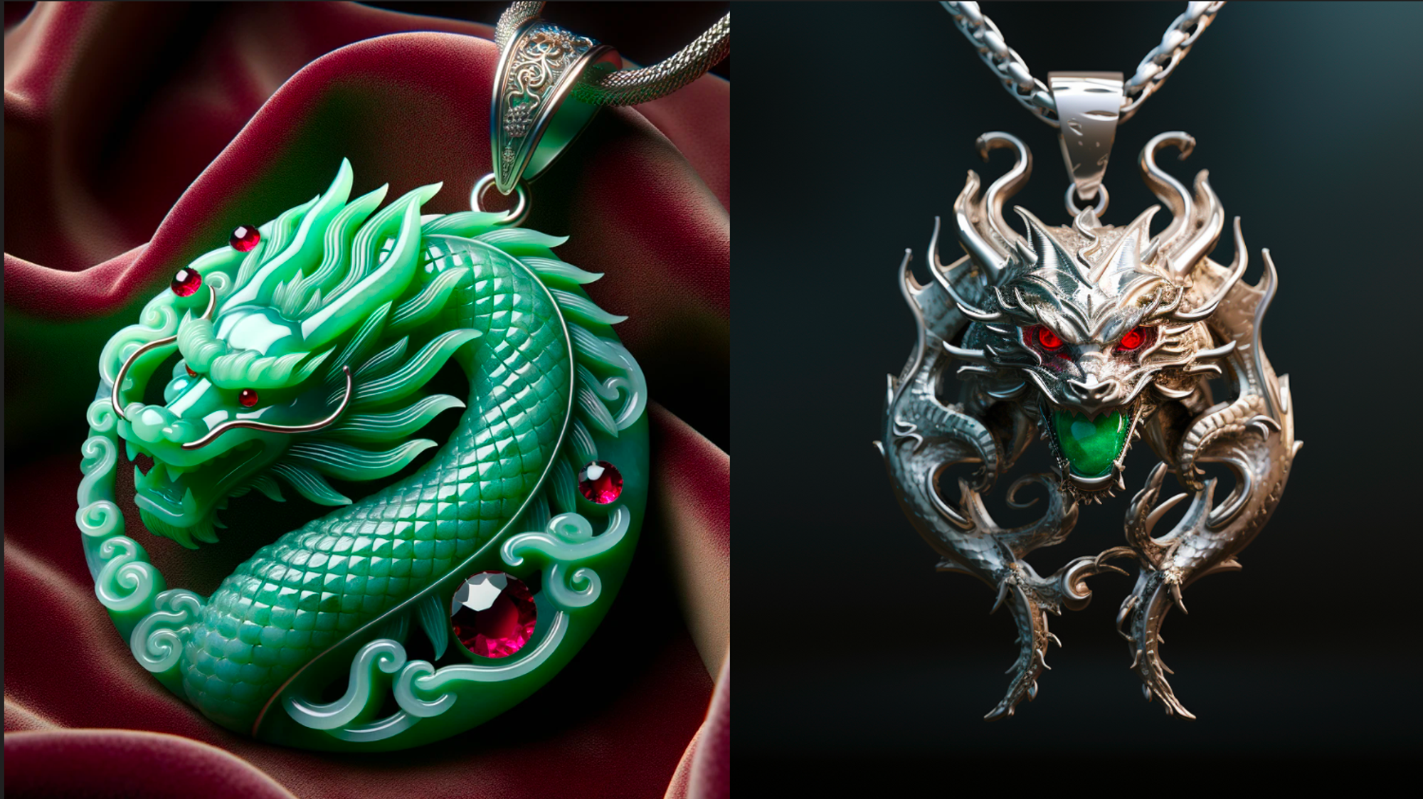 จี้ของ Dall-E (ด้านซ้าย) เข้ากับรูปลักษณ์ 'หยก' อย่างใกล้ชิดกับสีเขียวและมีดวงตาสีแดงทับทิม แต่สร้อยคอเงินดูหนากว่าที่คาดไว้ ฉากหลังดูเหมือนกำมะหยี่