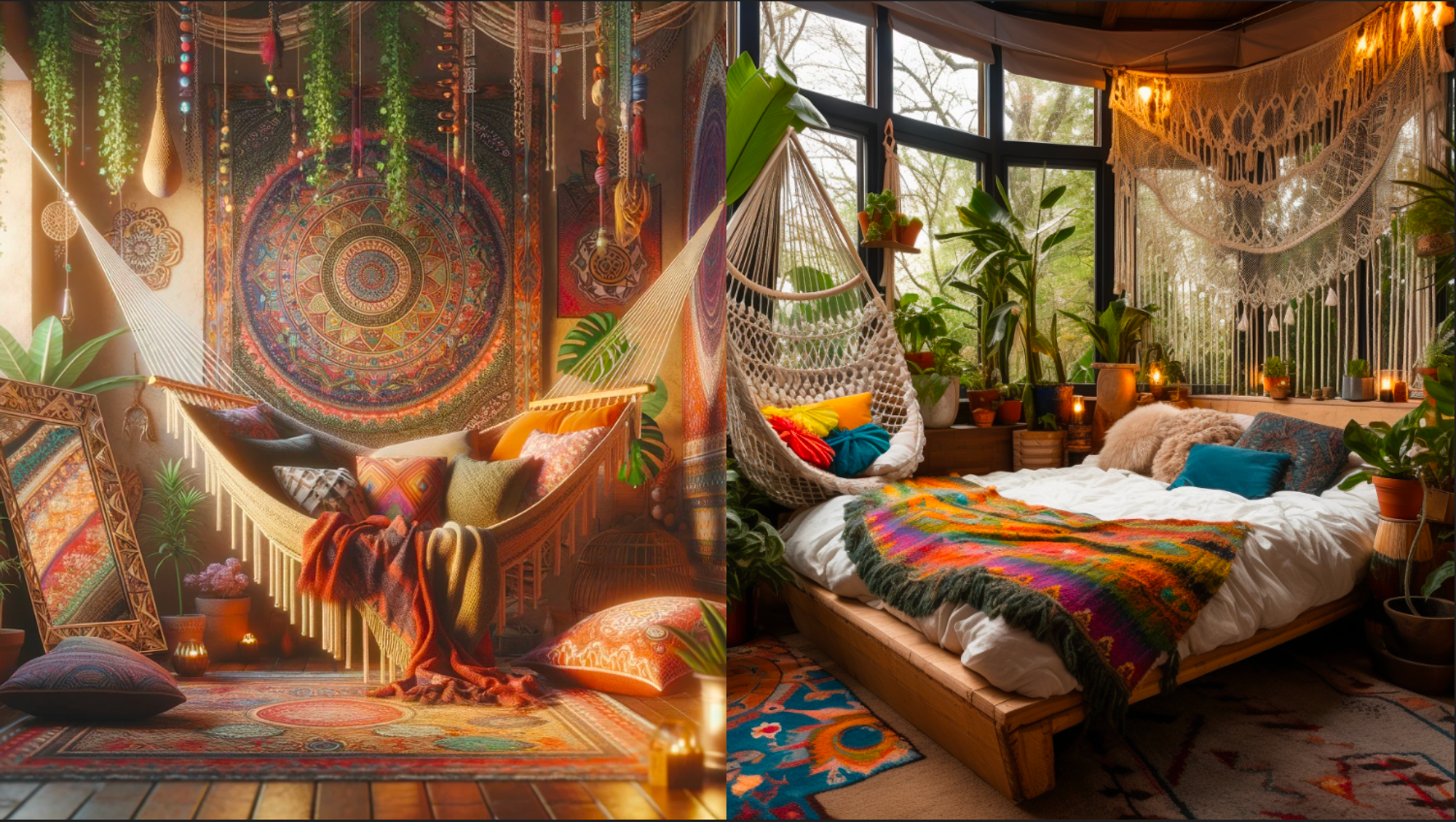 ทั้งสองภาพถ่ายทอดความรู้สึกของห้องนอนสไตล์โบฮีเมียน ภาพของ Dall-E (ซ้าย) เต็มไปด้วยสีสันด้วยลวดลาย มีที่นั่งคล้ายเปลญวน ผ้าม่านใส และต้นไม้แขวนอยู่มากมาย แต่ไม่มีกระจกโมเสก
