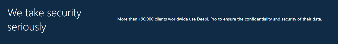 นอกจากนี้ พวกเขายังได้รับการรับรอง ISO 27001 และทำการทดสอบการเจาะเป็นประจำเพื่อความปลอดภัยตลอดเวลา แนวทางปฏิบัติด้านความปลอดภัยทั้งหมดเหล่านี้ทำให้คุณสามารถผ่อนคลายและไว้วางใจ DeepL ได้อย่างเต็มที่