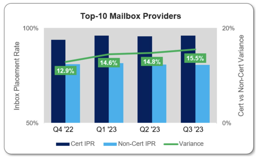 การรวบรวมข้อมูลตำแหน่งกล่องจดหมายสำหรับ MBP 10 อันดับแรก (คิดเป็น>90 เปอร์เซ็นต์ ของเจ้าของที่อยู่อีเมลทั้งหมด ซึ่งวัดจากการถ่วงน้ำหนักเริ่มต้นของเรา) ช่วยให้ข้อมูลเชิงลึกเหล่านี้บรรเทาลงได้อย่างมากแม้กระทั่งก่อนแบล็คฟรายเดย์ ช่องว่างด้านประสิทธิภาพการจัดส่งสำหรับผู้ส่งที่ได้รับการรับรองเทียบกับผู้ส่งที่ไม่ได้รับการรับรองในขณะนี้อยู่ที่ 11.9เปอร์เซ็นต์การส่งมอบเริ่มยากขึ้น—เพิ่มเติมเกี่ยวกับเรื่องนี้ในอีกสักครู่!