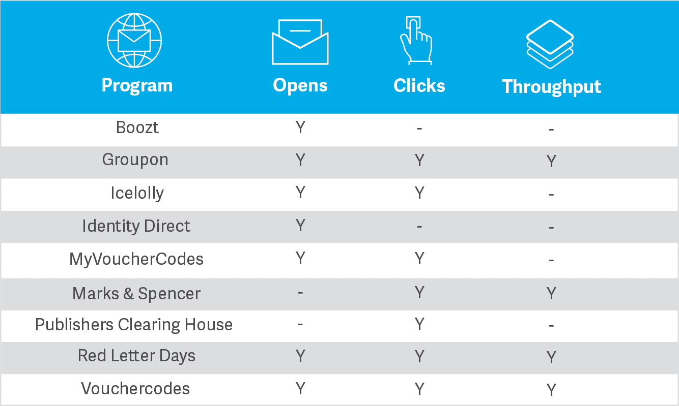 สิ่งนี้ยากกว่าที่เราจะวัดโดยตรง อย่างไรก็ตาม เราถามลูกค้าหลายรายว่าการรับรองมีผลในเชิงบวกต่อการตอบสนองหรือความสามารถในการเพิ่มปริมาณงานหรือไม่ สรุปคำตอบคือใช่ดังก้อง หลักฐานแสดงให้เห็นอย่างชัดเจนในกรณีศึกษาที่ลูกค้าอนุมัติหลายกรณี ตารางด้านล่างแสดงสรุปกรณีศึกษาล่าสุดที่มีการกล่าวถึงการเปิด การคลิก หรือปริมาณงาน (โปรดทราบว่าการไม่มี "Y" ในตารางหมายความว่าลูกค้าไม่ได้กล่าวถึงผลประโยชน์ ไม่ใช่ว่าพวกเขาไม่เห็นผลประโยชน์นั้น)