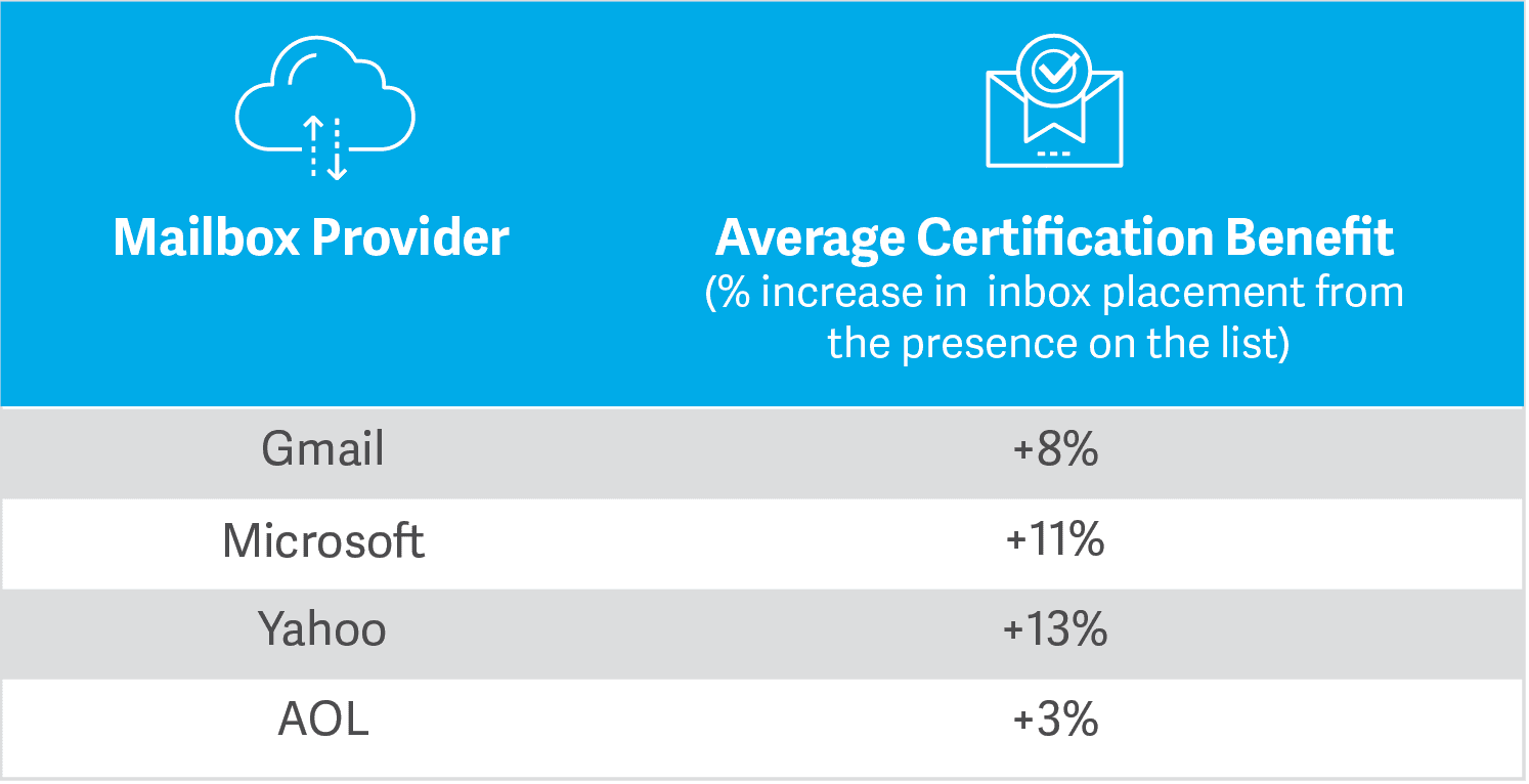 ลูกค้าเหล่านี้มี แนวทางปฏิบัติในการส่ง แบบเดียวกัน ก่อนและหลังการเปลี่ยนแปลงสถานะการรับรอง สิ่งเดียวที่เปลี่ยนแปลงคือความเป็นสมาชิกในโปรแกรมและการมีอยู่ของที่อยู่ IP ที่ส่งในรายการการรับรองที่เราเผยแพร่ไปยังพันธมิตรผู้ให้บริการกล่องจดหมายของเรา เราเห็นอะไร? การรับรองส่งผลกระทบอย่างมากในเชิงบวกและมีนัยสำคัญทางสถิติต่ออัตราการวางกล่องจดหมายในผู้ให้บริการกล่องจดหมายรายใหญ่ ผู้ให้บริการกล่องจดหมายให้ 'เครดิต' เพิ่มเติมแก่นักการตลาดผ่านอีเมลที่แสดงให้เห็นถึงความมุ่งมั่นในแนวทางปฏิบัติที่ดีที่สุดโดยการเข้าร่วมในการรับรอง RP