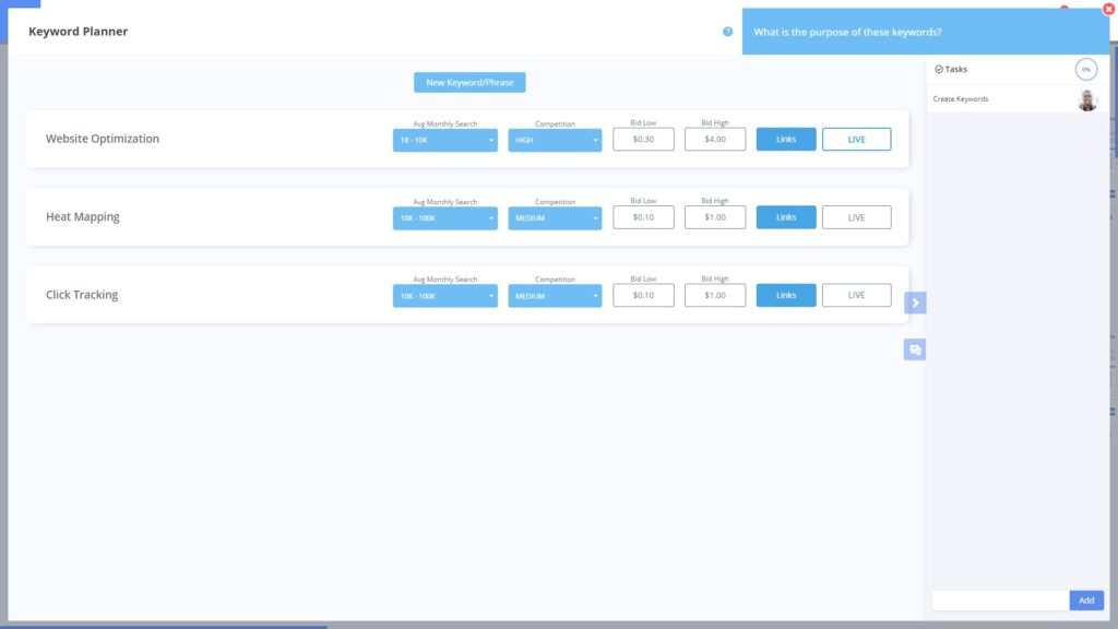 คำหลักสามารถแสดงรายการและแบ่งปันกับสมาชิกในทีมของคุณได้อย่างง่ายดายภายใน MarketPlan คีย์เวิร์ดที่เลือกสามารถตั้งค่าให้ใช้งานได้เพื่อให้แน่ใจว่าทุกคนรู้จักคีย์เวิร์ดที่จะจัดลำดับความสำคัญและดำเนินการต่อไป