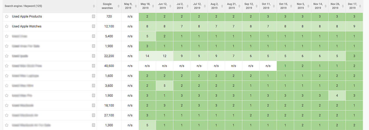 เรากำหนดเป้าหมายคำหลักทั่วไปที่เราสามารถเชื่อมโยงกลับไปยังหมวดหมู่ที่กว้างขึ้นบนไซต์ได้ ค้นหาว่าลูกค้าที่เพิ่งเริ่มทำการวิจัยเกี่ยวกับการซื้อคอมพิวเตอร์มักจะใช้ ข้อกำหนดเช่นผลิตภัณฑ์ Apple ที่ได้รับการตกแต่งใหม่หรือลดราคา Macbook จากคำหลักที่เรากำหนดเป้าหมาย มีข้อความค้นหา 18 คำที่ไม่เคยอยู่ในหน้าแรกของ Google มาก่อนแล้วที่หน้าแรก เรายังได้ย้าย 17 ที่เคยขึ้นหน้าหนึ่งมาอยู่ในตำแหน่งแรก