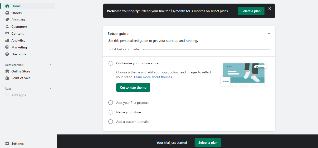 หากคุณยังไม่ได้ลงทะเบียนสำหรับบัญชี Shopify เลือกแผนที่เหมาะสมกับความต้องการของคุณ หรือใช้การทดลองใช้ฟรี 3 วันเพื่อค้นหาแพลตฟอร์มก่อนที่จะเลือกแผน