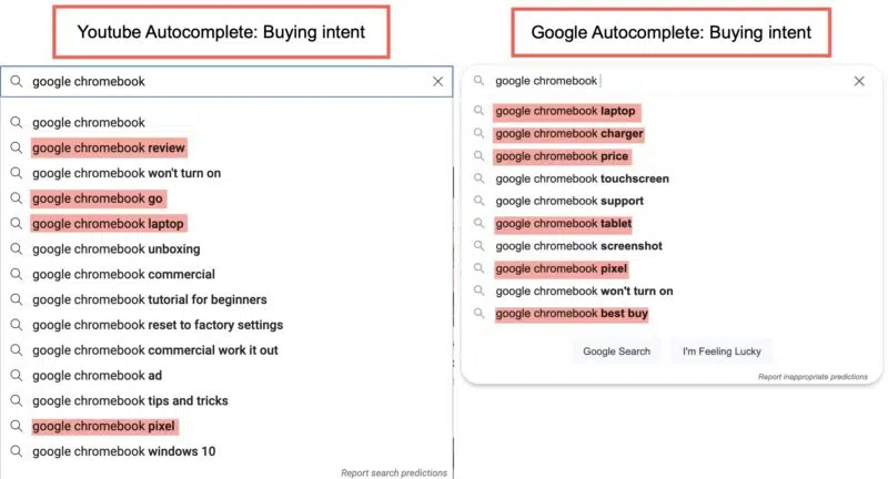 หากคุณเปรียบเทียบคำแนะนำอัตโนมัติของ Google และ YouTube คุณจะสังเกตเห็นว่าการค้นหาของ YouTube ดึงดูดผู้ชมบางประเภท ตัวอย่างเช่น หากคุณค้นหา Google Chromebook คำแนะนำยอดนิยมคือ แล็ปท็อป Google Chromebook ที่ชาร์จ Google Chromebook และราคา Google Chromebook ซึ่งทั้งสามอย่างนี้บ่งบอกถึงเจตนาในเชิงพาณิชย์อย่างชัดเจน (เช่น การเริ่มต้นเส้นทางการซื้อ)