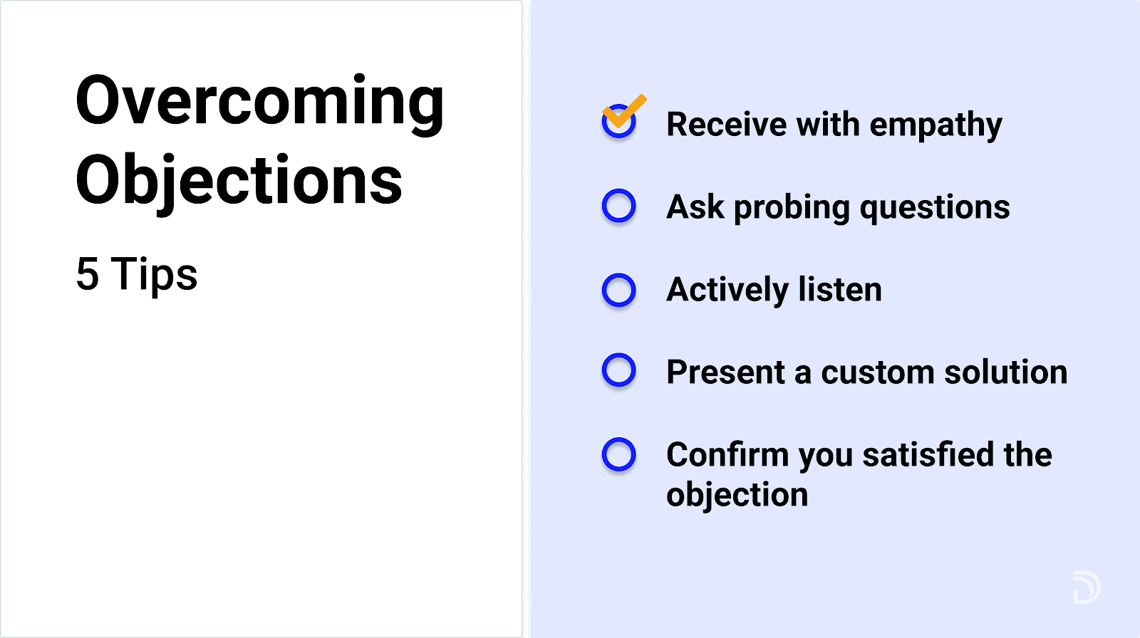 สิ่งสำคัญคือต้องจำไว้ว่าการคัดค้านในระหว่างการสาธิตผลิตภัณฑ์มักจะหมายถึงว่าผู้มีแนวโน้มจะเป็นลูกค้ากำลังพิจารณาผลิตภัณฑ์ของคุณและต้องการครอบคลุมทุกสถานการณ์ที่เป็นไปได้ ไม่ใช่เวลาที่จะโต้เถียง แต่เป็นเวลาที่จะให้ความกระจ่าง เคล็ดลับ 5 ข้อในการเอาชนะการคัดค้านมีดังนี้