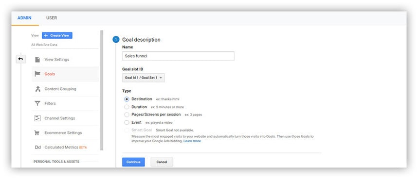 ในการสร้างช่องทาง เปิดส่วน ผู้ดูแลระบบ ใน Google Analytics และเลือกตัวเลือก เป้าหมาย