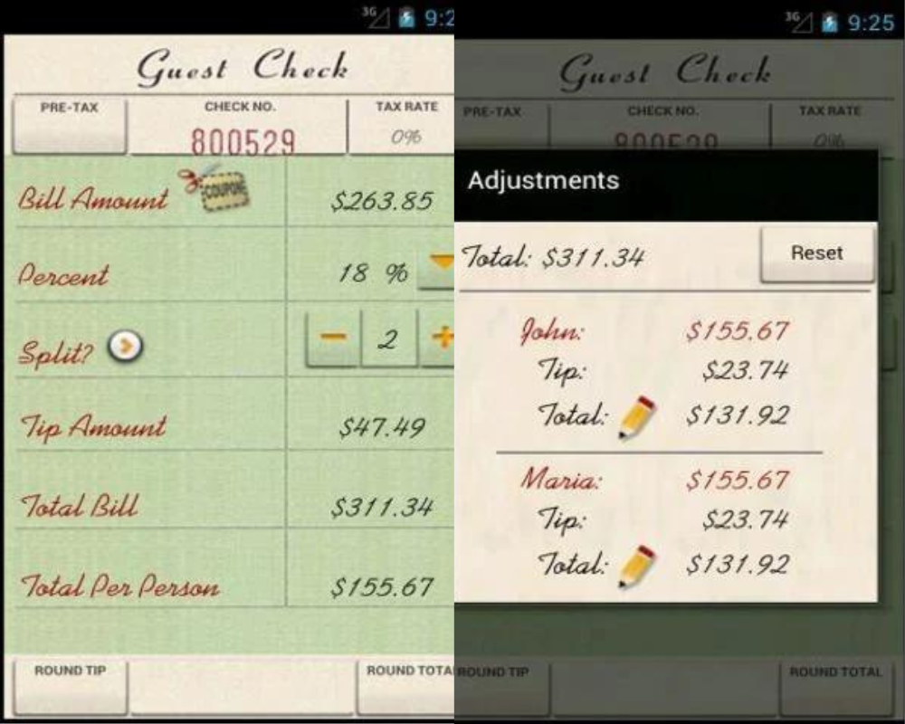 Tip N Split เป็นอีกหนึ่งแอปที่มีประโยชน์สำหรับอุปกรณ์ Android ช่วยให้คุณสามารถคำนวณทิปและแยกบิลทั้งหมดได้ในเวลาเพียง 5 วินาที มันสามารถแบ่งบิลระหว่างคนจำนวนเท่าใดก็ได้ที่รับประทานอาหารนอกบ้านด้วยกัน คุณสามารถปัดเศษขึ้นและปัดเศษลงบนจำนวนเท่าใดก็ได้ และเครื่องคิดเลขทิปนี้จะทำการเปลี่ยนแปลงจำนวนเงินตามนั้น