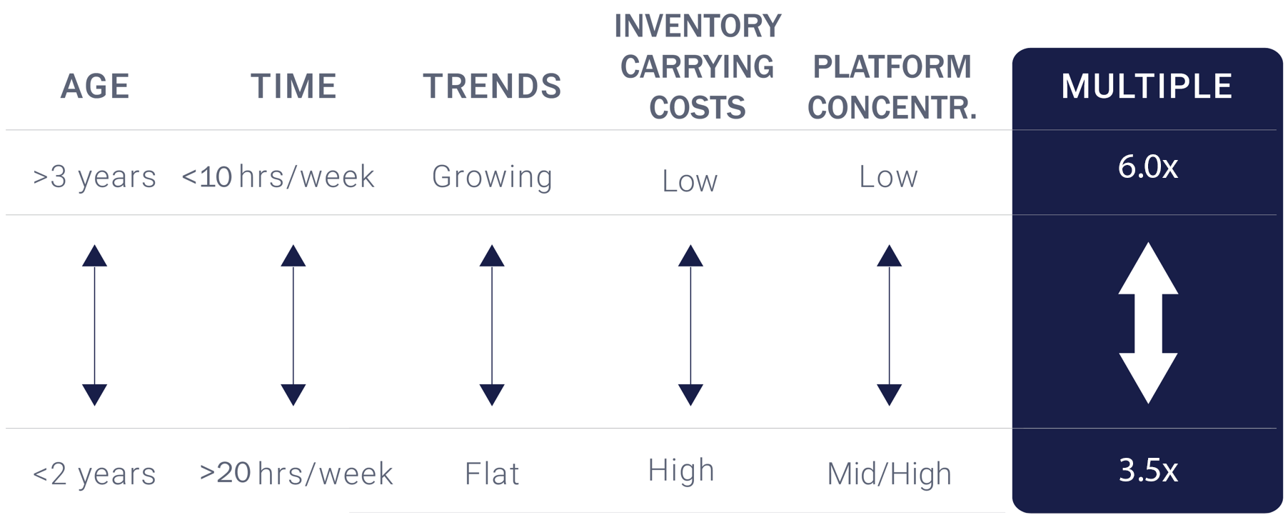 ขึ้นอยู่กับการวัดของตัวขับเคลื่อนการประเมินมูลค่าข้างต้น ธุรกิจอีคอมเมิร์ซควรอยู่ระหว่าง 3.5x และ 6.0x ทวีคูณของ SDE, EBITDA หรือรายได้: