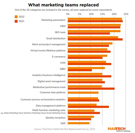 MAP ถูกแทนที่โดย 23% ของผู้ตอบแบบสอบถาม MarTech Replacement Survey ของเราในปี 2022 ซึ่งคล้ายกับ 23% ที่รายงานว่า MAP เข้ามาแทนที่ในปี 2021