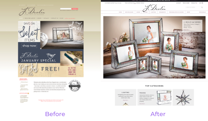 พิจารณาสิ่งที่เราทำกับ J Devlin Glass Art – ดูภาพของเว็บไซต์ก่อนและหลังด้านล่าง ด้านซ้ายมือคือไซต์ที่พวกเขามาหาเราเพื่อขอความช่วยเหลือในการออกแบบใหม่ แม้ว่าไซต์ที่น่าสนใจจะจัดแสดงงานฝีมือที่น่าดึงดูดไม่แพ้กัน แต่ไซต์ของพวกเขาก็เต็มไปด้วยข้อมูล ซึ่งอาจเต็มไปด้วยข้อมูลมากเกินไป ดวงตาไม่รู้ว่าจะพักผ่อนหรือทำอะไร ตรงกันข้ามกับผลิตภัณฑ์สำเร็จรูปที่ทีมงานของเราผลิตด้านล่าง ผลิตภัณฑ์มีความสำคัญมากกว่ามาก และข้อความส่วนใหญ่จำกัดไว้เฉพาะแผงตัวเลือกที่นำทางได้ง่ายซึ่งอยู่ด้านบน บางอย่างที่ง่ายพอๆ กับการออกแบบใหม่ในลักษณะดังกล่าว อาจส่งผลกระทบอย่างลึกซึ้งต่อวิธีที่ลูกค้าโต้ตอบกับไซต์ของคุณ และเมื่อทำเสร็จแล้วก็จะดีขึ้น