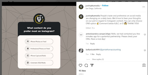 Aşağıda Justinphumedia tarafından oluşturulan bir IG anketi örneği verilmiştir:
