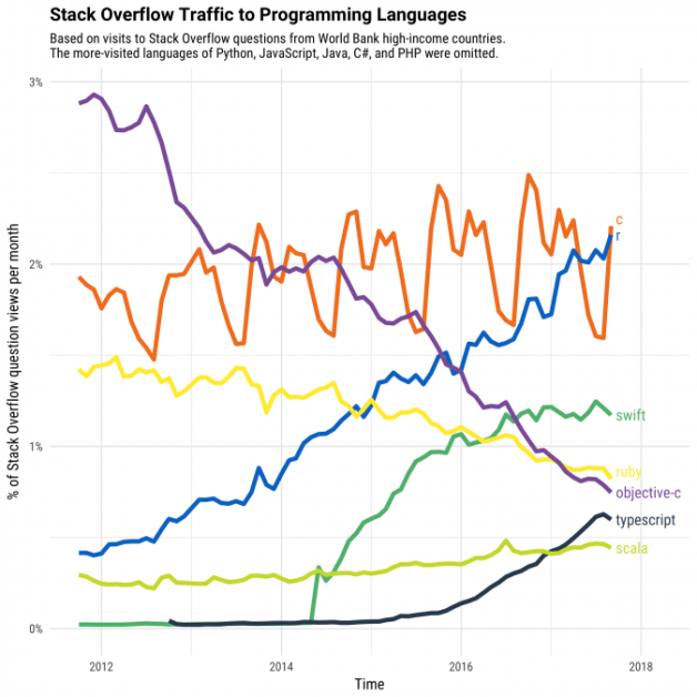 Bir Yığın Taşması analizine göre, R'nin popülaritesi son birkaç yıldır artıyor.