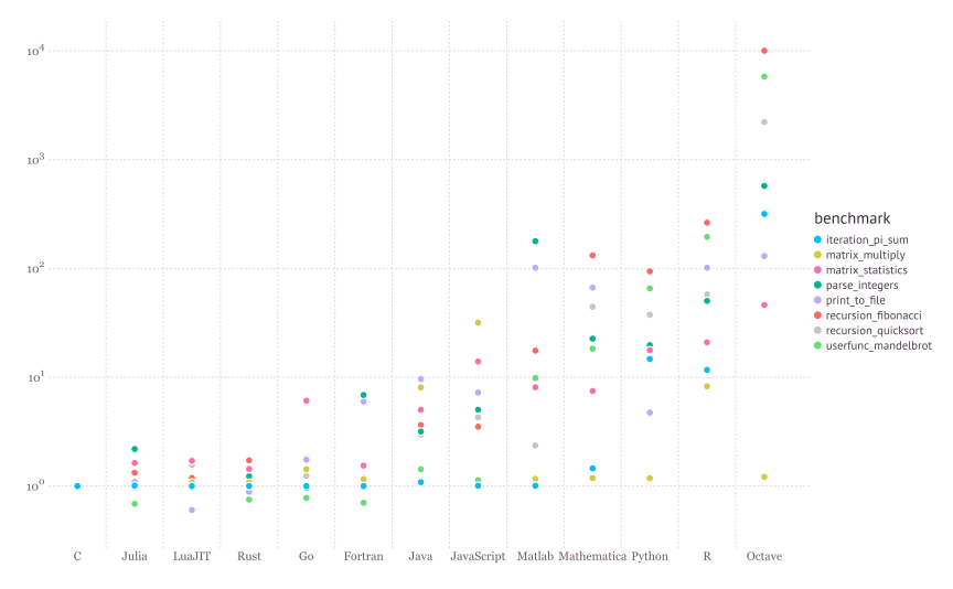 Julia'nın ana avantajlarından biri hızıdır, C, Rust, Lua ve Go gibi dillerle karşılaştırılabilir. Bunun nedeni, Tam Zamanında (JIT) derlenmiş olmasıdır.