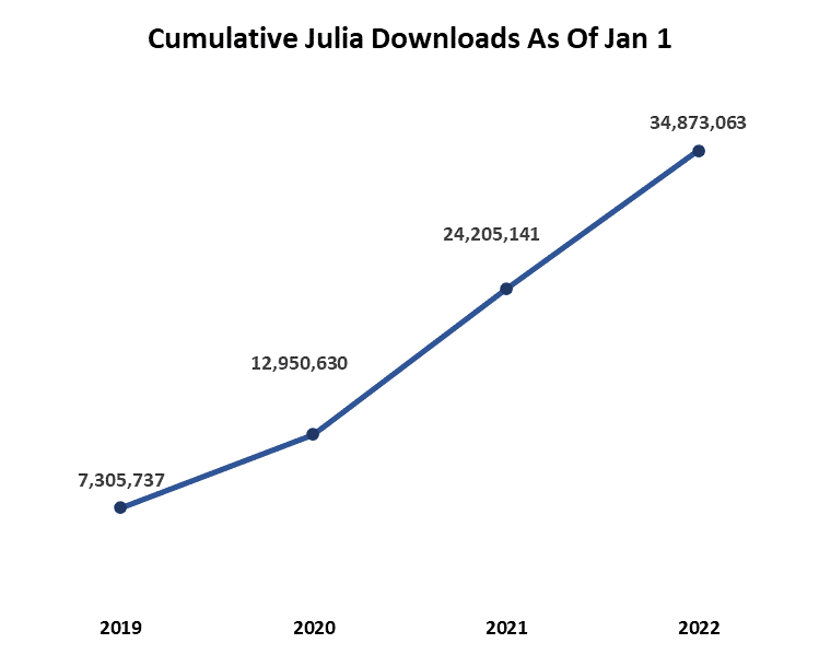 Son birkaç yıldır Julia, kullanıcı tabanını önemli ölçüde artırdı. Bunu 2022 itibariyle birikmiş indirme sayısında görebiliriz.