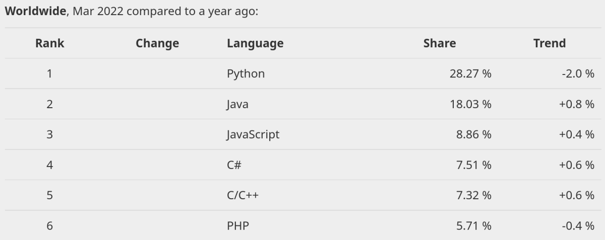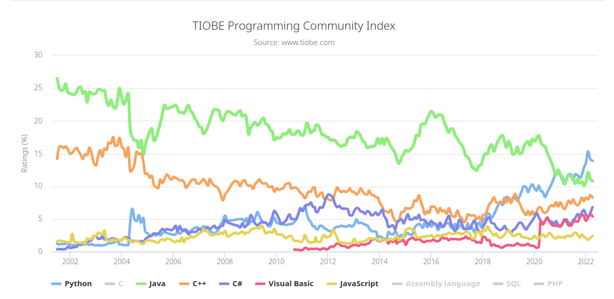 Günümüzde Python en çok kullanılan programlama dilidir. PYPL ve TIOBE gibi birçok programlama dili indeksi bunu doğrulamaktadır.