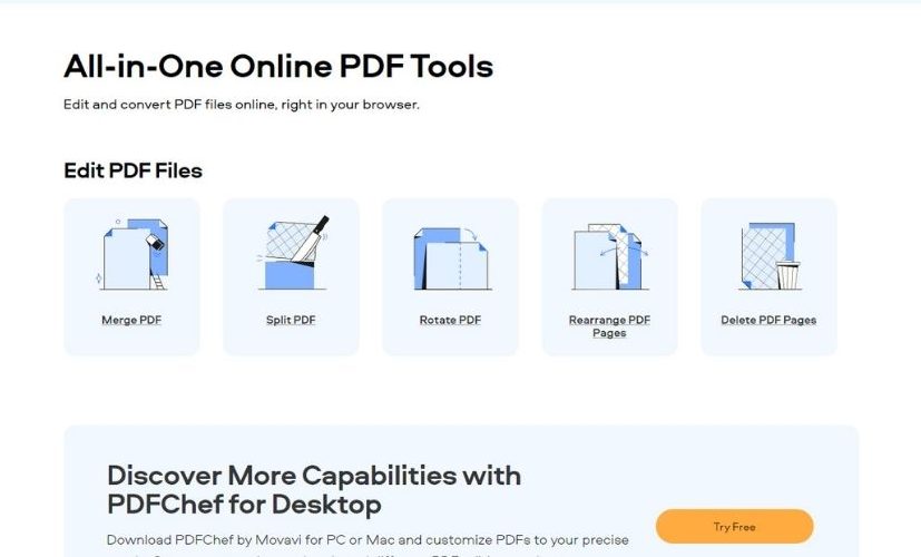 PDFChef, EPUB dosyalarınızı PDF formatına dönüştürmenize yardımcı olan en popüler çevrimiçi araçlardan biridir. Bu web tabanlı araç kullanıcı dostudur ve tüm işletim sistemlerinde çalışır; Windows, Linux ve Mac. PDFChef, EPUB'dan PDF'ye dönüştürücünün yanı sıra başka düzenleme araçları da sunar.