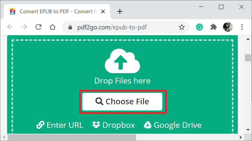 EPUB dosyalarını PDF'ye dönüştürme işleminin tamamı PDF2GO aracında oldukça basittir. EPUB dosyalarınızı yerel depolama biriminden veya Google Drive/DropBox'tan yüklemeniz gerekir. Yükleme başarılı olduktan sonra yeşil Başlat düğmesine basın.
