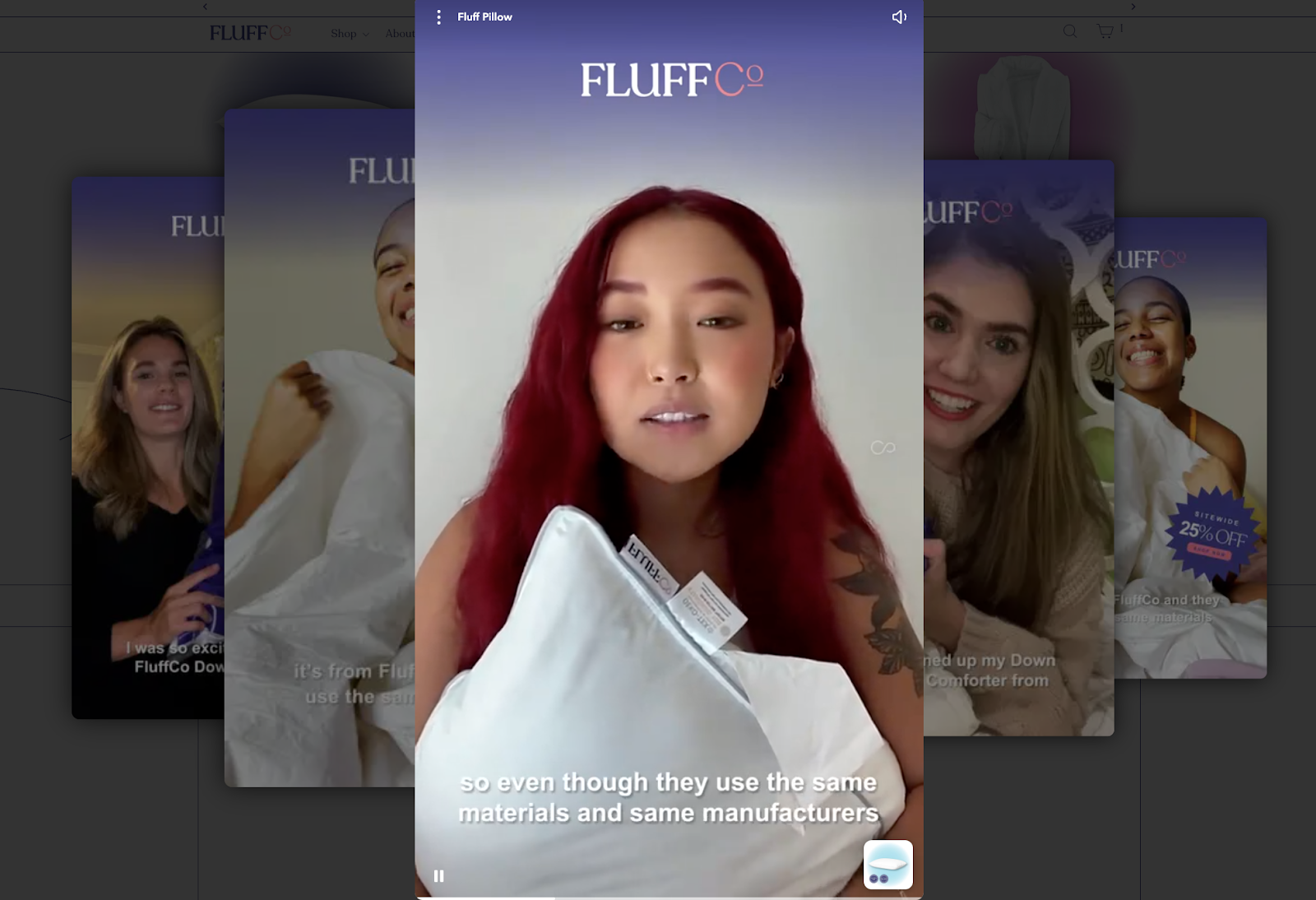 - Ana sayfaya geldiğinizde, alt köşede sitenin otomatik olarak UGC'yi (kullanıcı tarafından oluşturulan içerik) oynattığı, müşterilerin Fluff Co ürünlerinin yararları hakkında konuştuğu videolar olan bir video widget'ı göreceksiniz. Bu şekilde, mağaza ziyaretçilerine sürekli olarak sosyal kanıt sağlanır ve doğal olarak sunulan ürünlere daha fazla güven duyulur.