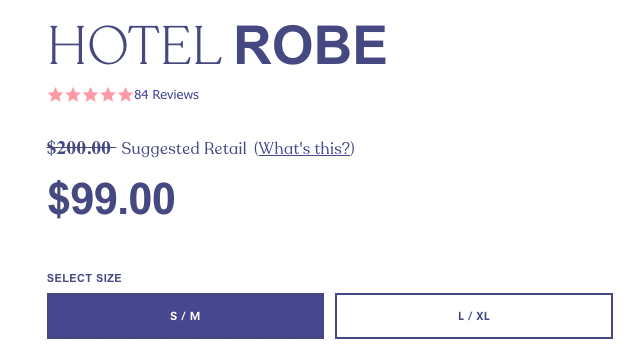 - Fiyat her zaman ürün sayfasında indirimli olarak gösterilir . Bu, Fluff Co'nun orijinal fiyatından bir indirim değil, müşterilerin bu mağazadan satın alırken yapacakları tasarrufların bir görselleştirmesidir. Ziyaretçiler, "Önerilen perakende" bağlantısını tıklayarak, Fluff Co.'nun rekabete kıyasla olumlu olduğu ve Fluff Co.'dan satın alma güvenini artıran bölüme gelecekler.