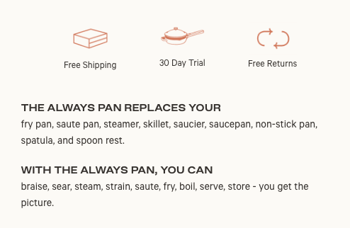 - Ürün sayfasının ana bölümünde ürün avantajlarına ilişkin hatırlatmalar. Bu kısa metin, müşteriye ürünü neden satın almak istedikleri konusunda güvence verir.
