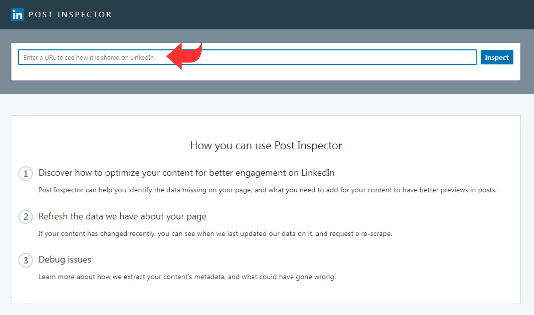 - LinkedIn Açık Grafik Hata Ayıklayıcı – Açık grafik meta etiketleri gönderinizin bağlantı önizlemesinde görünür.Gönderi denetçisini kullanarak etiket hatalarını tanımlayabilir ve çözebilirsiniz.