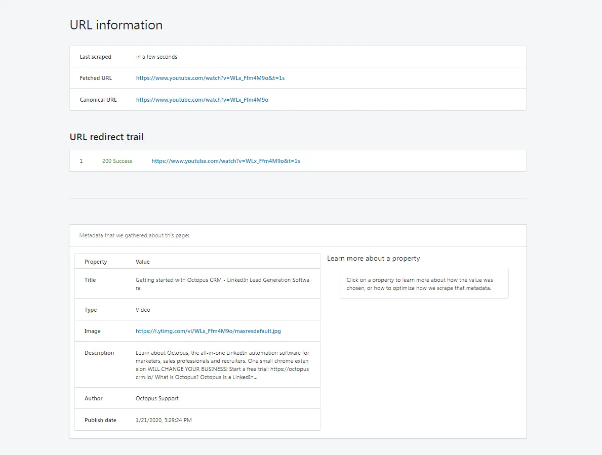 Örneğin, daha fazla web sitesi trafiğini artırmak için ana sayfanızın URL'sini paylaşabilirsiniz. Veya bilgilendirici bir makarayı paylaşmak için bir Insta bağlantısı ekleyebilirsiniz. Bir videoyu paylaştığınızda LinkedIn denetçi aracı aşağıdaki bilgileri sağlayacaktır: