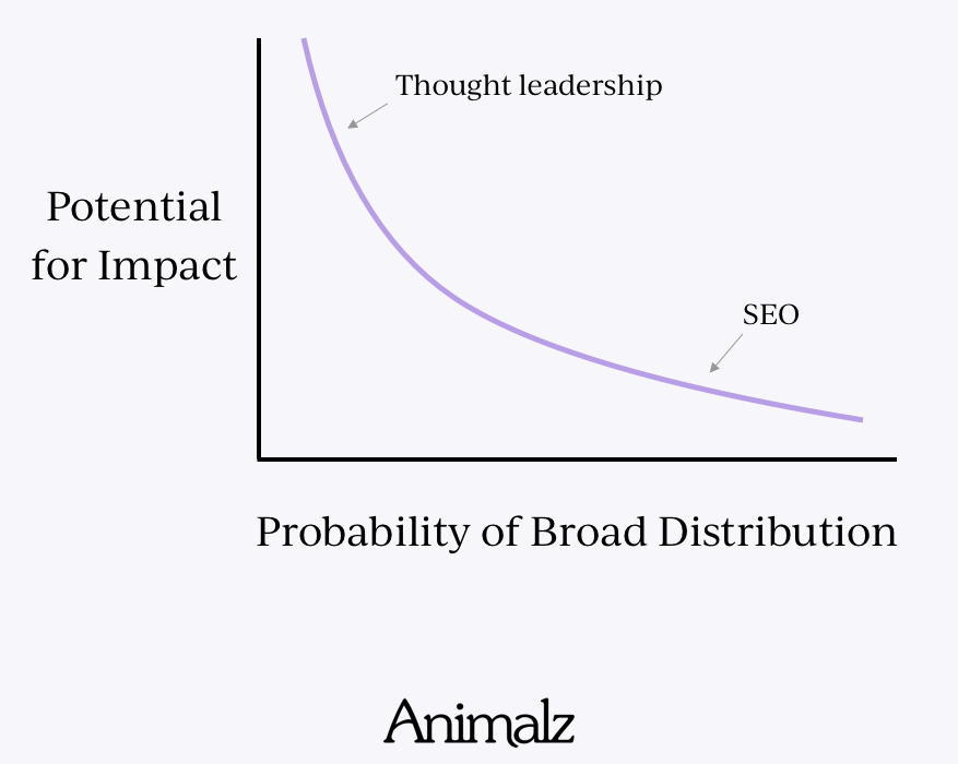 Kalabalık bir alanda bir hareket yaratmak için - burada Animalz'da yapmaya çalıştığımız şey tam olarak bu - içeriğinizin gerçek bir öze ihtiyacı var. Akılda kalıcı başlıklar ve "yerleşik dağıtım" yardımcı olur, ancak içeriğin dalga yaratması için çok gerçek bir yumruk atması gerekir. Bunu, yerleşik en iyi uygulamalara aykırı yaklaşımlar sunarak (bkz: Bir Kitleye İhtiyacınız Yok) ve şekilsiz fikirlerin etrafına çizgiler çizerek (bkz: Dönüşüm Hunisinin Başı İçeriği Her Türlü Sorunu Yaratır—Ama Yine de Yaratmalısınız).