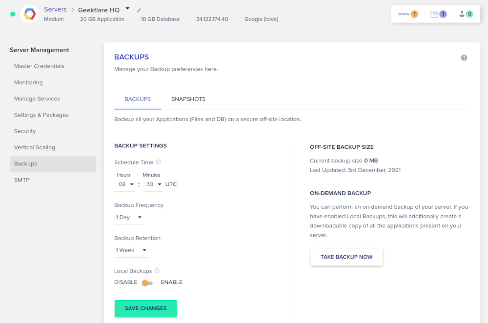 Ayrıca, mevcut seçeneklere (ve tercihlerinize) göre yedekleme sıklığını ve saklama süresini değiştirebilirsiniz. Dilerseniz yedekleri sunucunuza yerel yedekler olarak da kaydedebilirsiniz.