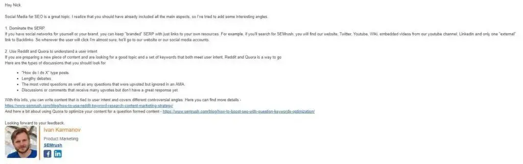 SEMRush'ta Ürün Pazarlamadan sorumlu Ivan Karmanov, sosyal medyayı kullanarak içeriği yönetmeye gelince, yeterince kullanılmayan iki platform tespit ediyor. Hem Reddit hem de Quora'nın kullanıcı amacını anlamak için harika olduğuna inanıyor. Site sahiplerinin, kullanıcıların gerçekten ilgilendiklerini belirlemelerine yardımcı olabilirler. Daha sonra içerikleri, bunu yansıtacak şekilde uyarlanabilir.