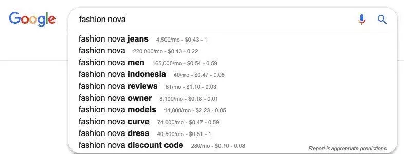 Bunun uygulamadaki güzel bir örneği, giyim markası Fashion Nova'dır. Sitenin geleneksel SEO'su hakkında hiçbir şey, sitenin rekabetçi anahtar kelimeler için sıralanması gerektiğini önermedi, ancak öyle. Ayda on binlerce markalı arama, Google'a, insanların aradıklarına göre şirketin sıralamasının ne olması gerektiği konusunda fikir verir.