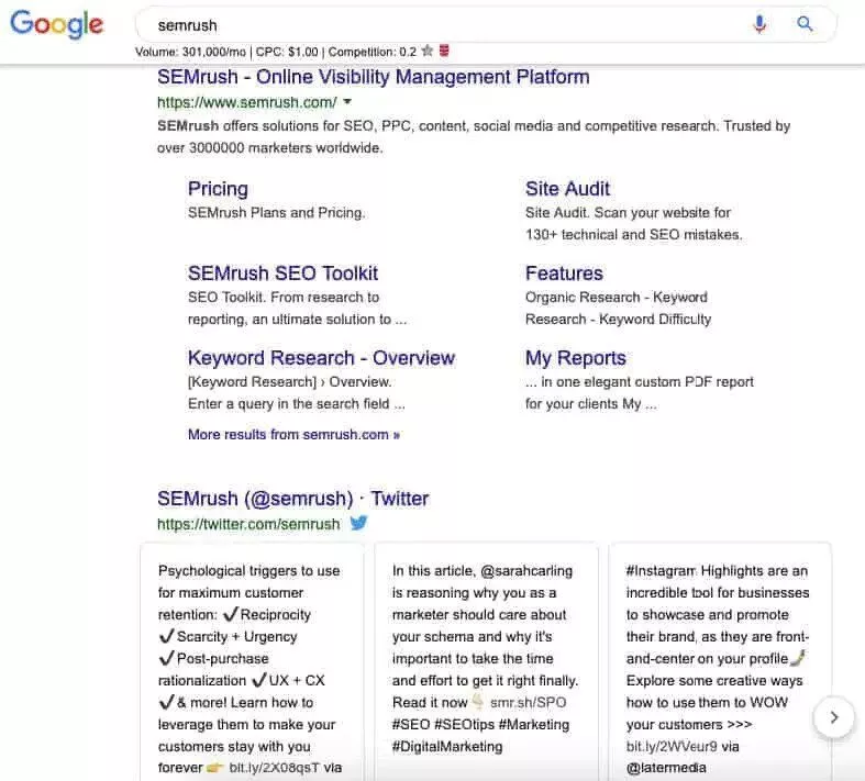 Örneğin, SEMrush için bir Google araması yapın. SEMrush'ın birçok sosyal profilini içeren bir ilk sayfa döndürür. Bu, markanın ana sitesinin ve diğer sayfalarının yanındadır.