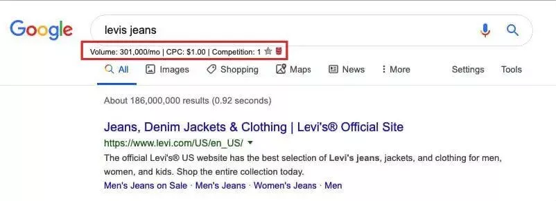 Marka çağrışımının Google için bir sıralama faktörü olduğu gösterildi. Google'ın bir ürünü arayan kişiler için en alakalı sonuçları sağlamaya çalıştığı göz önüne alındığında bu mantıklıdır. Levis'in jean terimi için yapılan organik arama sonuçlarında nasıl üçüncü sırada yer aldığını aşağıdaki örnekte görebilirsiniz.