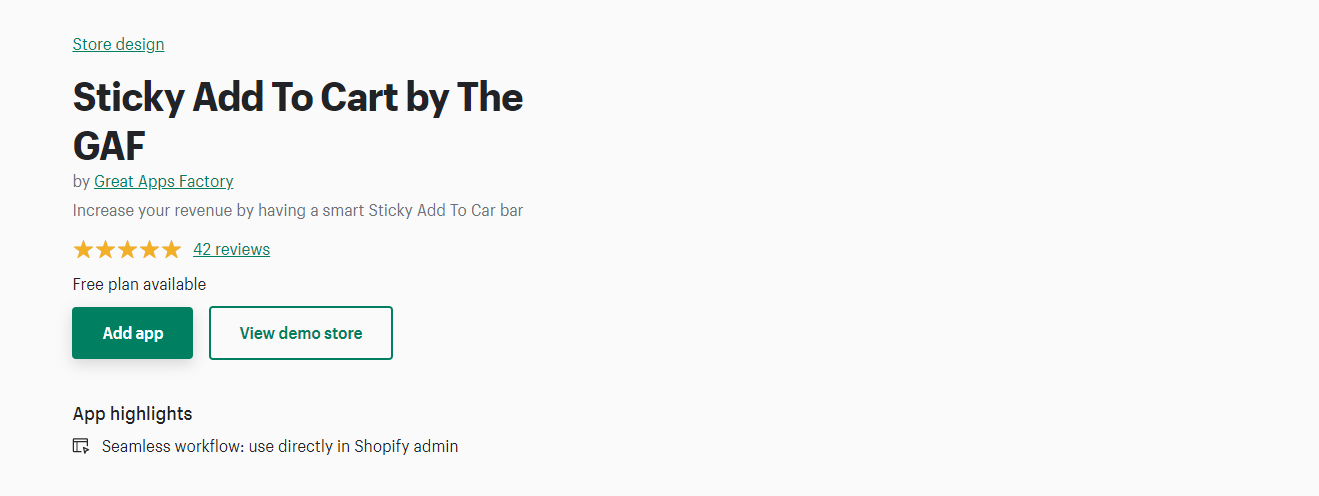 Gaf 的 Sticky Add to Cart 将帮助您增加收入并通过其功能将客户留在您的商店中。 该应用程序监控客户并向客户展示他们希望在特定销售点看到的内容,例如,当客户看到产品并想要将其添加到购物车时,会立即出现“粘性添加到购物车”,以便客户可以直接加入购物车