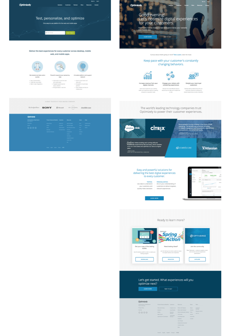 以Optimizely为例。 Optimizely 是一种网站优化工具,可为客户提供许多功能,包括网站个性化。 在屏幕截图中,他们展示了如何自定义主页以鼓励访问者成为潜在客户。 左边是旧的非个性化主页。 右图显示了他们个性化主页的布局。
