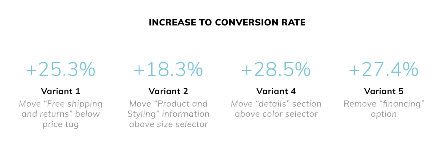 多变体测试显示了哪些变体带来了最多的转化和新的收入。 这是一项奢侈品电子商务业务,即使转化率的小幅上升也可以显示收入的显着增长,这意味着他们可以获得相当多的收益。 在这种情况下,几乎每个变体都显示出转化和收入的正增长。 总体而言,实施这些更改导致在短短几周内收入增加了 29%。