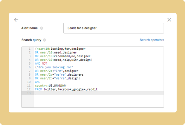 上面的示例将为美国跨社交媒体的设计师收集销售线索,并排除其他提供其服务的设计师或代理商。 如果布尔搜索听起来很有趣,请查看布尔搜索的完整指南,以获取详细说明和说明性示例。