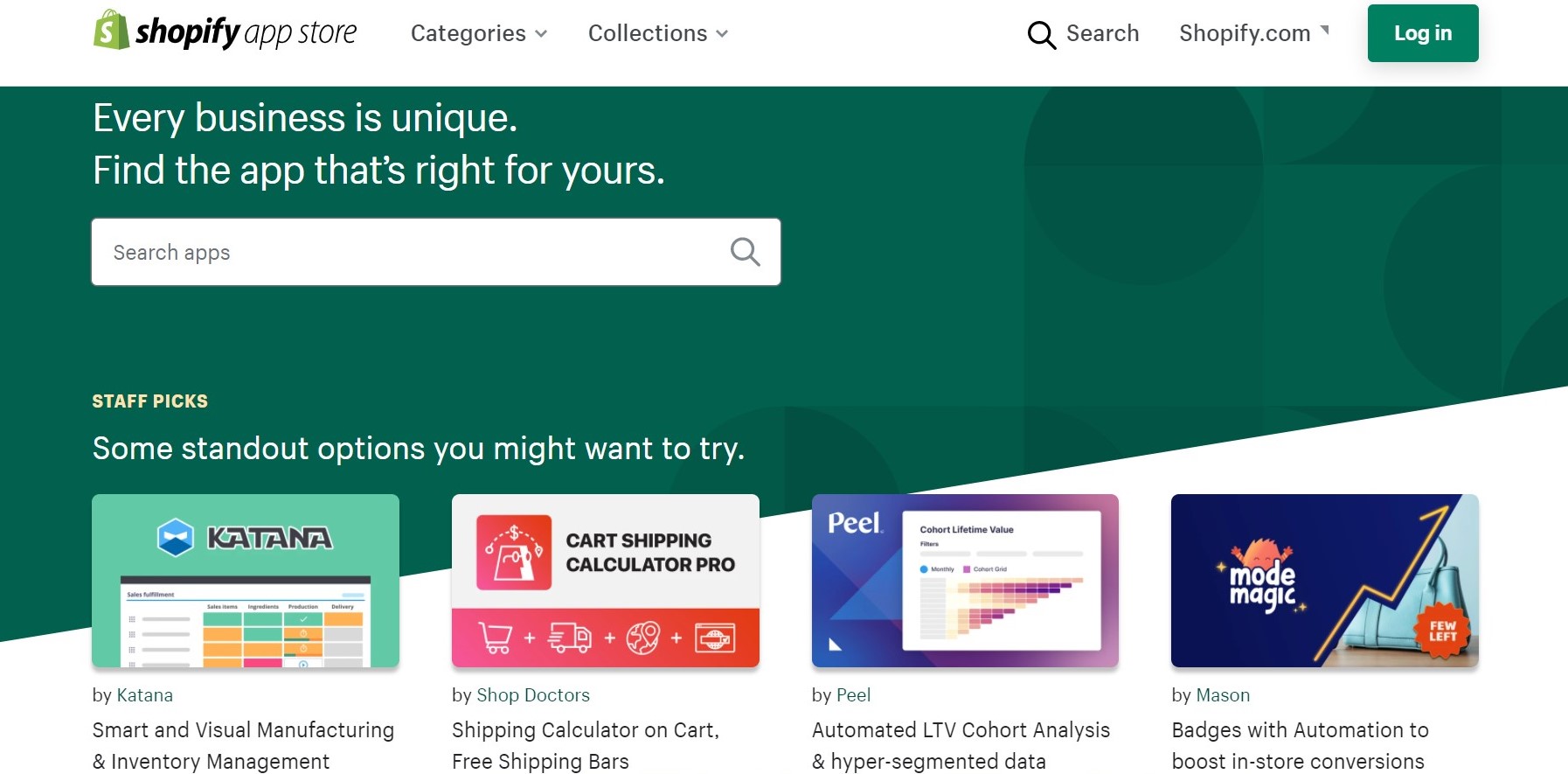 Shopify有可供选择,以扩展在线商店超过3K的应用程序。 在Shopify的App Store提供的应用程序 分为“寻找产品”、“销售地点”、 “商店设计”、“营销”、“销售和转化”等类别。Shopify 应用程序有助于增强您的 Shopify 管理员或添加新功能。