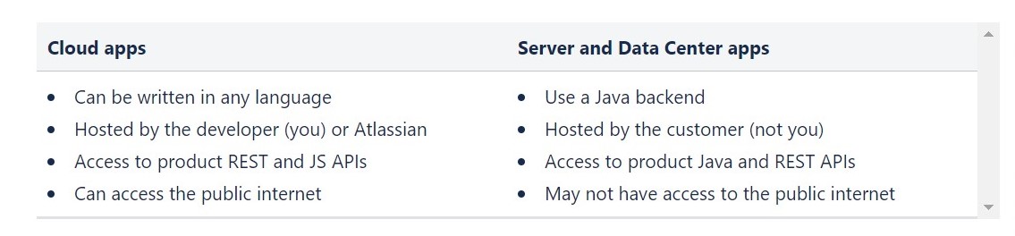 如果您想探索使用Atlassian开发应用程序,可以在其网站上为开发人员提供资源,包括构建应用程序的分步指南。 第一步是确定您要为哪个Atlassian 产品开发应用程序。 接下来是选择部署选项。 各有利弊。 请记住,服务器正在逐步淘汰,因此您可能希望使用云或数据中心。